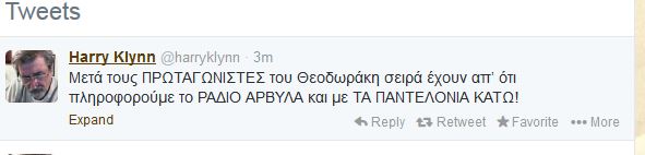 «Μετά τους ΠΡΩΤΑΓΩΝΙΣΤΕΣ του Θεοδωράκη σειρά έχουν απ’ ότι πληροφορούμε το ΡΑΔΙΟ ΑΡΒΥΛΑ και με ΤΑ ΠΑΝΤΕΛΟΝΙΑ ΚΑΤΩ!», έγραψε ο Χάρρυ Κλυνν.