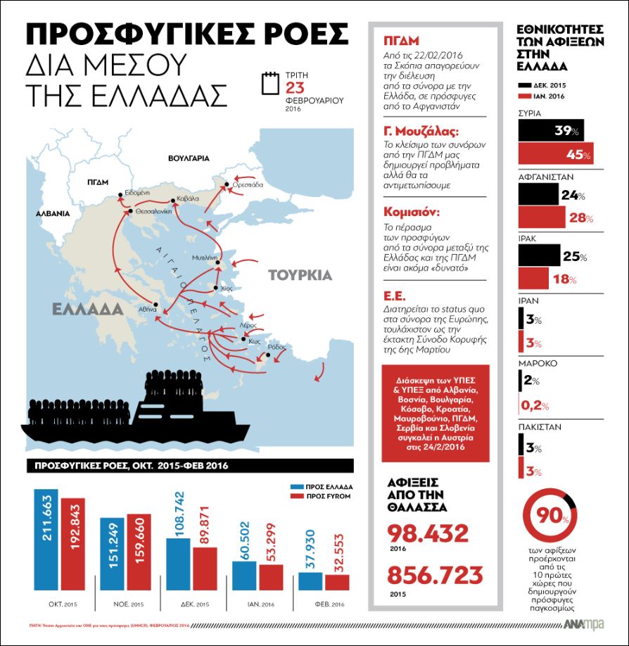 Το γράφημα αποτυπώνει τις κινήσεις προσφύγων προς τα ελληνικά νησιά και την ηπειρωτική χώρα και τις μετακινήσεις τους προς την ΠΓΔΜ, από την 1η Οκτωβρίου 2015 έως και τις 22 Φεβρουαρίου 2016, βάσει στοιχείων της Ύπατης Αρμοστείας του ΟΗΕ για τους πρόσφυγες (UNHCR).