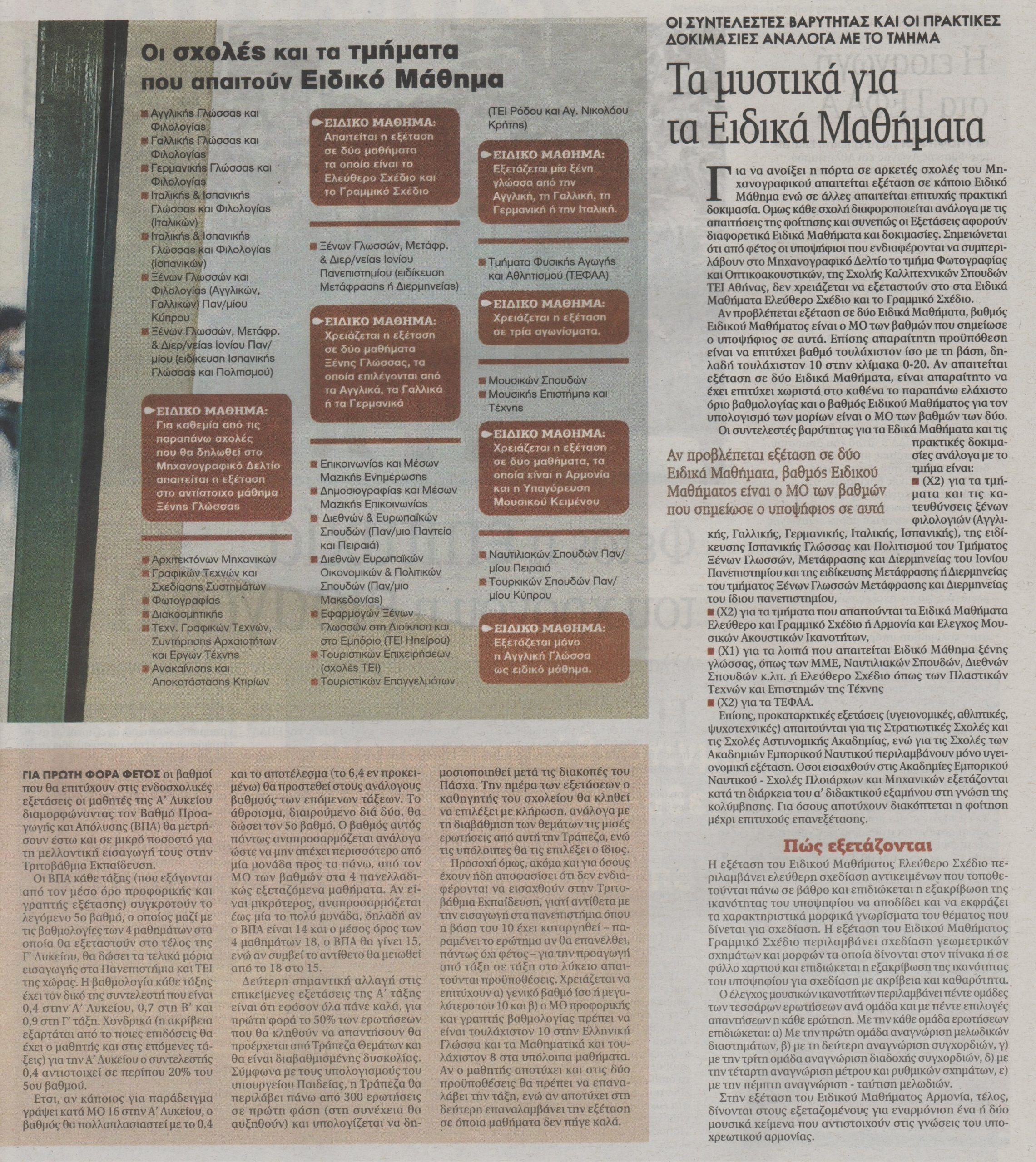 Όμως προσοχή, γιατί όσοι επιτύχουν σε αυτές θα εισαχθούν του χρόνου. Επίσης παρουσιάζονται πληροφορίες και για τις στρατιωτικές σχολές. Ακόμη, συγκεντρώσαμε όσα χρειάζονται για τα ειδικά μαθήματα που απαιτούνται σε αρκετά τμήματα πανεπιστημίων και ΤΕΙ, τους συντελεστές, τον τρόπο υπολογισμού της βαθμολογίας, τη μέθοδο εξέτασης κα τις πρακτικές δοκιμασίες που απαιτούνται σε άλλα τμήματα. Τέλος, οι μαθητές της Α΄ τάξης πρέπει από εφέτος να είναι ιδιαίτερα προσεκτικοί, καθώς ο βαθμός τους θα προσμετρηθεί- σε μικρό ποσοστό- για την εισαγωγή στην Τριτοβάθμια Εκπαίδευση.