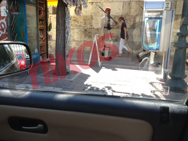 Αναγνώστης του enikos.gr μας έστειλε φωτογραφία από την Λεωφόρο Βασιλίσσης Σοφίας μπροστά από τα «Λουλουδάδικα» την ώρα που γινόταν η «αλλαγή» των ευζώνων. Οι άντρες της Προεδρικής Φρουράς είναι υποχρεωμένοι να βαδίζουν εντός των διαγραμμίσεων επί του πεζοδρομίου που βρίσκεται δίπλα από τη Βουλή, όμως η πινακίδα του περίπτερου τους αναγκάζει να «ελιχθούν» ώστε να φτάσουν στο μνημείο του Άγνωστου Στραιώτη.