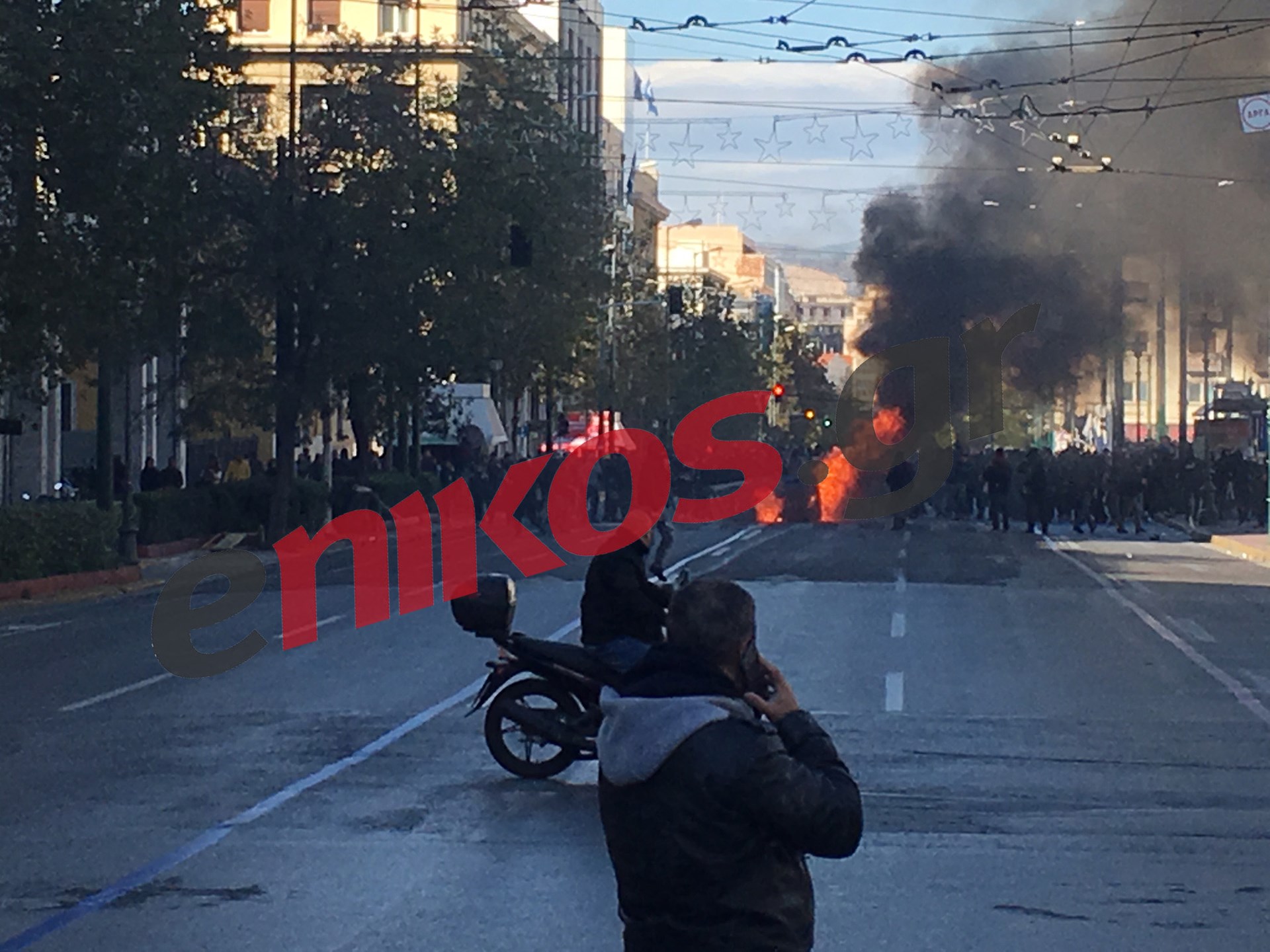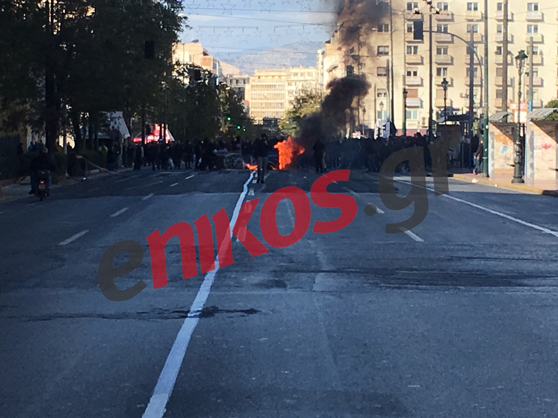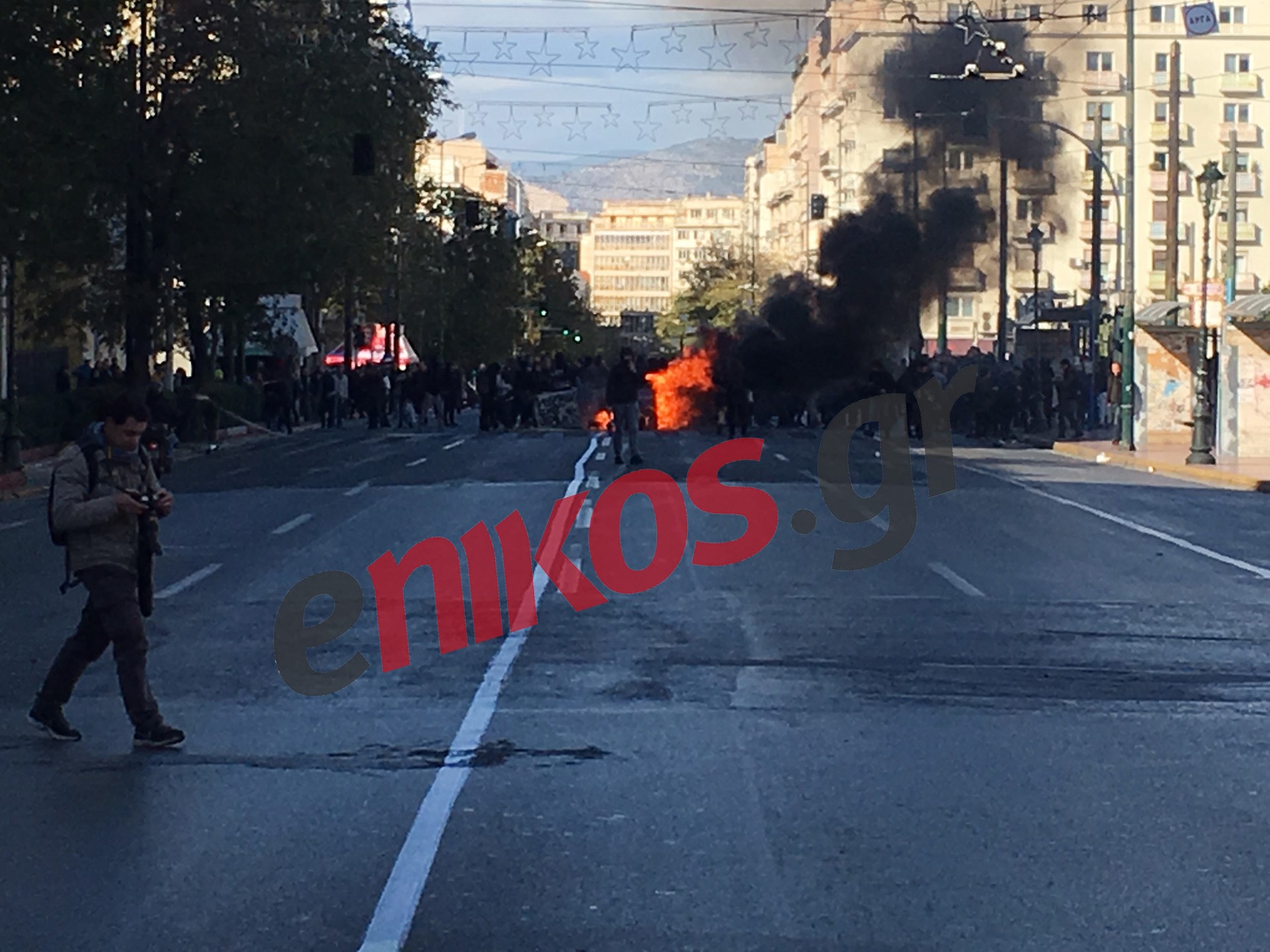 Δείτε τις φωτογραφίες του enikos.gr με ομάδες νεαρών που έχουν συγκεντρωθεί στην Πανεπιστημίου και έχουν βάλει φωτιές σε κάδους, στη μέση του οδοστρώματος.