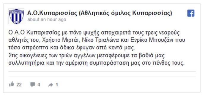 Οι τρεις ανήλικοι που έχασαν τη Δευτέρα τη ζωή τους σε τραγικό τροχαίο στην περιοχή Τερψιθέας, είχαν γνωριστεί στην ποδοσφαιρική ομάδα του Αθλητικού Ομίλου Κυπαρισσίας και από τότε έκαναν μεταξύ τους πολύ παρέα.Ο ΑΟ Κυπαρισσίας, με σχετική ανάρτηση του αποχαιρετά μέσω Facebook τους τρεις αθλητές του ανακοινώνοντας ταυτόχρονα και το τραγικό συμβάν στα social media.«Ο Α.Ο Κυπαρισσίας με πόνο ψυχής αποχαιρετά τους τρεις νεαρούς αθλητές του, Χρήστο Μιρτάι, Νίκο Τριαλώνα και Ενρίκο Μπουζάνι που τόσο απρόοπτα και άδικα έφυγαν από κοντά μας. Στις οικογένειες των τριών αγγέλων μεταφέρουμε τα βαθιά μας συλλυπητήρια και την αμέριστη συμπαράσταση μας στο πένθος τους» έγραψε σε σχετική ανάρτηση. Δείτε την ανάρτηση της ομάδας:
