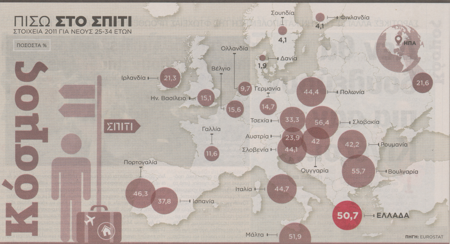 Συγκεκριμένα το 35% των ανδρών 25 ως 34 ετών στη «γηραιά ήπειρο» -και το 21% των γυναικών της ίδιας ηλικίας- υπολογίζεται ότι μένει σήμερα ��αζί με τη μαμά και τον μπαμπά. Η έκρηξη της ανεργίας, το μεγάλο κόστος των σπουδών, η αύξηση στις τιμές των ακινήτων, ο πολλαπλασιασμός των διαζυγίων και των χωρισμών λόγω κρίσης, αλλά και η πίεση στον επαγγελματικό στίβο ωθούν τους νεαρούς ενήλικες να επιστρέφουν μαζικά στα… εφηβικά τους δωμάτια.