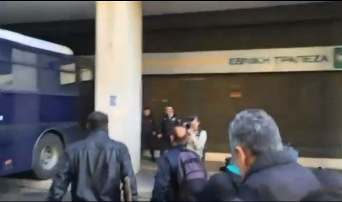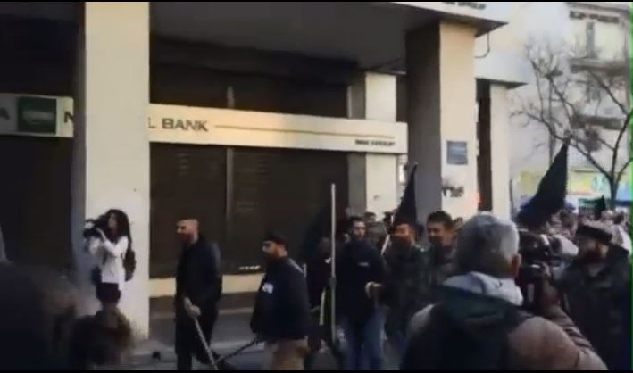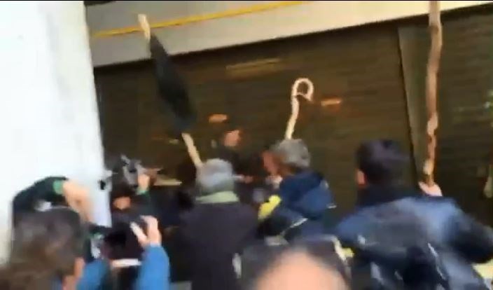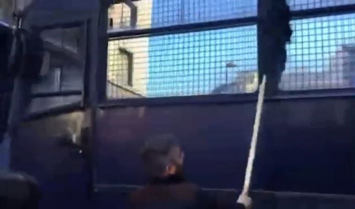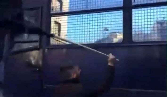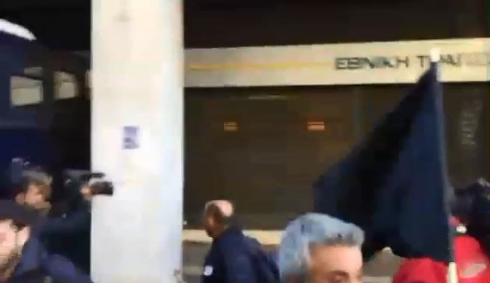 Οι αγρότες που διαδηλώνουν έξω από το υπουργείο Αγροτικής Ανάπτυξης χτυπούν με τις κατσούνες τους άνδρες των ΜΑΤ που βρίσκονται έξω από την είσοδο του υπουργείου, απαντώντας με ρίψη χημικών.
