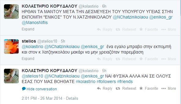 Στον επίσημο λογαριασμό τους στο Twitter, οι απεργοί πείνας-νοσηλευόμενοι των φυλακών Κορυδαλλού αναφέρθηκαν στη συμβολή της εκπομπής του Νίκου Χατζηνικολάου, «στον ενικό», στο μεγάλο πρόβλημα που αντιμετώπιζαν στο νοσοκομείο των φυλακών.