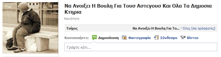 Εκστρατεία έχει ξεκινήσει στο facebook, με τίτλο “Να ανοίξει η βουλή για τους άστεγους και όλα τα δημόσια κτίρια”, καθώς ιδρύθηκε και oμάδα.Με τον τίτλο “Κανένας Άστεγος”, κυκλοφορεί αφίσα στο facebook, για την άμεση αξιοποίηση κτιρίων του ελληνικού κράτους που βρίσκονται σε χρόνια αχρηστία.Μάλιστα οι χρήστες υποστηρίζουν ότι “Αυτοί που δημιούργησαν τους άστεγους με τις πολιτικές τους, είναι υπεύθυνοι βάσει της κάρτας Ανθρωπίνων Δικαιωμάτων του ΟΗΕ που έχουμε υπογράψει, να τους βρουν στέγη”.