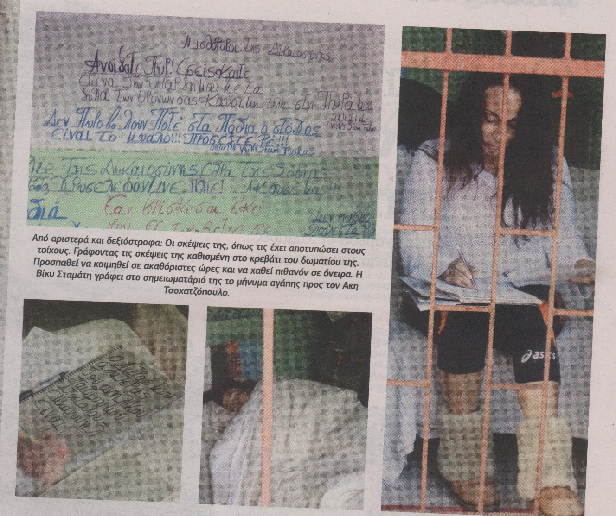 Το γραπτό μήνυμα στον άνδρα της δεν ήταν το μόνο. Βιώνοντας εδώ και μήνες τις επιπτώσεις του «Akisgate», στο οποίο συμμετείχε και εκείνη με τον τρόπο της, ξεσπάει την οργή που νιώθει για την κράτησή της με το γράψιμο. Κάτι που φαίνεται στις φωτογραφίες που δημοσιεύουν σήμερα τα Παραπολιτικά και στις οποίες η Βίκυ Σταμάτη φαίνεται να επιδίδεται σε διάφορες δραστηριότητες μέσα στο μικρό της δωμάτιο. Στους τοίχους, που πλέον έχουν γεμίσει, ξεχωρίζει ένα τελευταίο γραπτό μήνυμα, με ημερομηνία 21 Δεκεμβρίου και ξεκάθαρο αποδέκτη: «Μισθοφόροι της δικαιοσύνης. Ανοίξατε πυρ! Εσείς καίτε εμένα, την ύπαρξή μου με τα ξύλα των θρόνων σας! Καύσιμη ύλη στην πυρά μου».