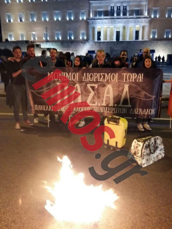 Μέλη του Πανελλήνιου Συλλόγου Αναπληρωτών Δασκάλων περνώντας μπροστά από τη Βουλή έκαψαν συμβολικά βαλίτσες, θέλοντας να εκφράσουν τη διαμαρτυρία τους για την χρόνια εκπαιδευτική περιπλάνηση και ανασφάλειά τους, απαιτώντας μόνιμους διορισμούς.