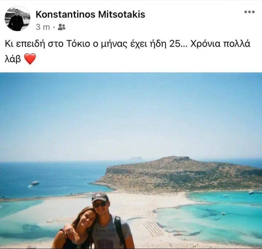 “Κι επειδή στο Τόκιο ο μήνας έχει ήδη 25… Χρόνια πολλά λαβ” έγραψε στη λεζάντα. Η φωτογραφία είναι από τις κοινές τους διακοπές στα Χανιά λίγο πριν η αθλήτρια αναχωρήσει για το Τόκιο. Οι δύο νέοι έζησαν μια ρομαντική απόδραση στο Ακρωτήρι Χανίων έχοντας την ευκαιρία να ξεκουραστούν για μία εβδομάδα και να αφιερώσουν χρόνο ο ένας στον άλλο.