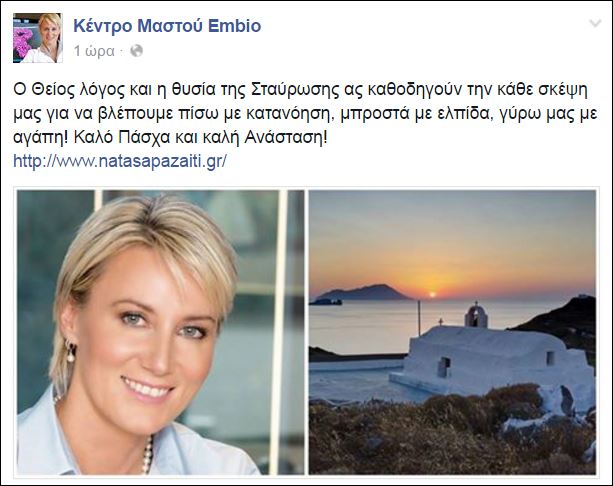 Ευχές για το Πάσχα στέλνει μέσω του προσωπικού της λογαριασμού στο facebook η Νατάστα Παζαΐτη.