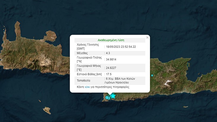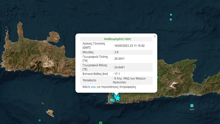 Σύμφωνα με την αναθεωρημένη λύση του Γεωδυναμικού Ινστιτούτου Αθηνών, το επίκεντρο του σεισμού εντοπίζεται 7 χλμ. νότιο-νοτιοδυτικά των Μοιρών Ηρακλείου, ενώ εστιακό βάθος υπολογίζεται στα 8,9 χλμ. Η ισχυρή σεισμική δόνηση είναι στο ίδιο σημείο με τα 4,2 Ρίχτερ που σημειώθηκαν το βράδυ της Τετάρτης.