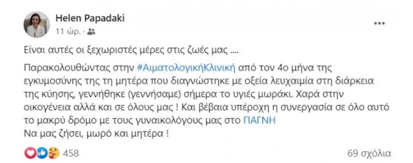 «Είναι αυτές οι ξεχωριστές μέρες στις ζωές μας… Παρακολουθώντας στην Αιματολογική Κλινική από τον 4ο μήνα της εγκυμοσύνης της τη μητέρα που διαγνώστηκε με οξεία λευχαιμία στη διάρκεια της κύησης, γεννήθηκε (γεννήσαμε) σήμερα το υγιές μωράκι. Χαρά στην οικογένεια αλλά και σε όλους μας. Και βέβαια υπέροχη η συνεργασία σε όλον αυτό τον μακρύ δρόμο με τους γυναικολόγους μας στο ΠΑΓΝΗ. Να μας ζήσει, μωρό και μητέρα».