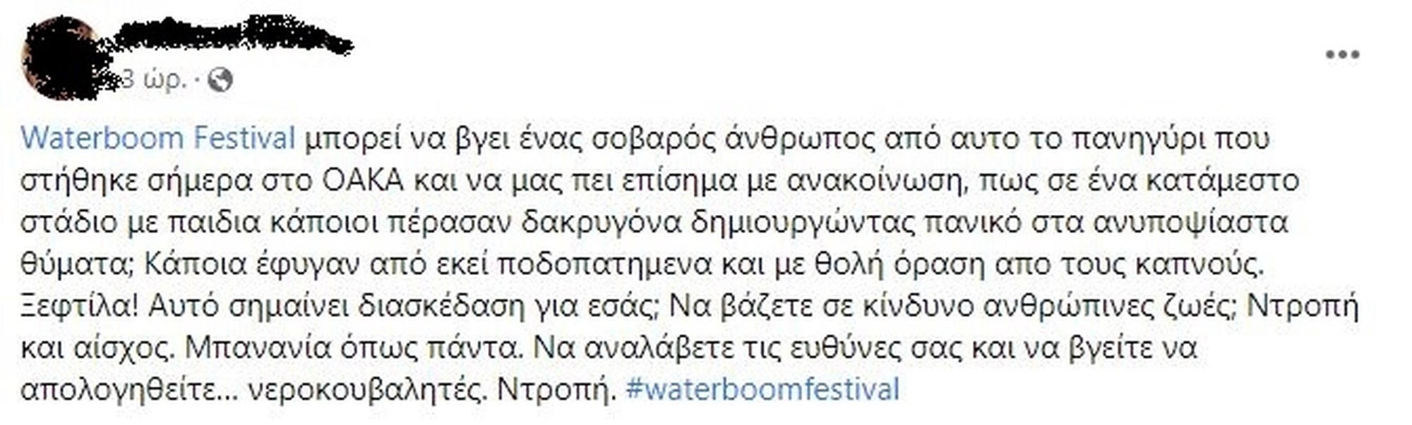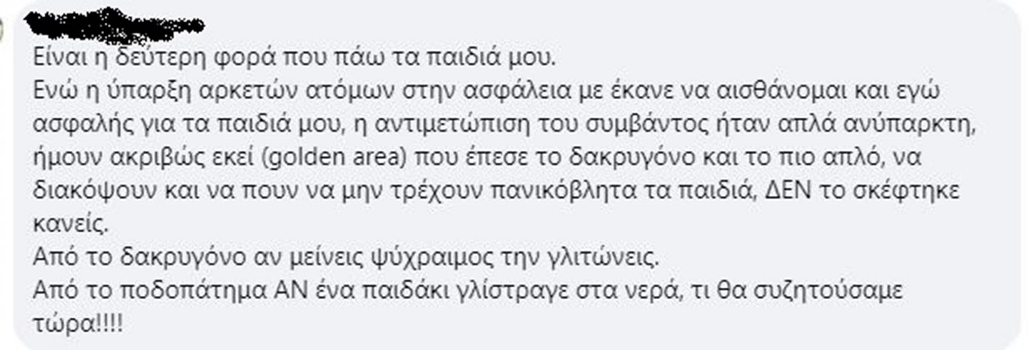 “Είναι η δεύτερη φορά που πάω τα παιδιά μου. Ενώ η ύπαρξη αρκετών ατόμων στην ασφάλεια με έκανε να αισθάνομαι και εγώ ασφαλής για τα παιδιά μου, η αντιμετώπιση του συμβάντος ήταν απλά ανύπαρκτη, ήμουν ακριβώς εκεί (golden area) που έπεσε το δακρυγόνο και το πιο απλό, να διακόψουν και να πουν να μην τρέχουν πανικόβλητα τα παιδιά, ΔΕΝ το σκέφτηκε κανείς. Από το δακρυγόνο αν μείνεις ψύχραιμος την γλιτώνεις. Από το ποδοπάτημα ΑΝ ένα παιδάκι γλίστραγε στα νερά, τι θα συζητούσαμε τώρα!!!!”, αναφέρει πατέρας στο Facebook.
