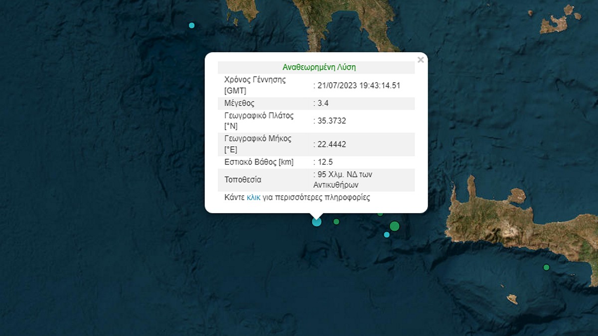 Ειδικότερα, σύμφωνα με το Γεωδυναμικό Ινστιτούτο, η σεισμική δόνηση έχει επίκεντρο 95 χιλιόμετρα Νοτιοδυτικά των Αντικυθήρων, με εστιακό βάθος 12,5 χιλιομέτρων.