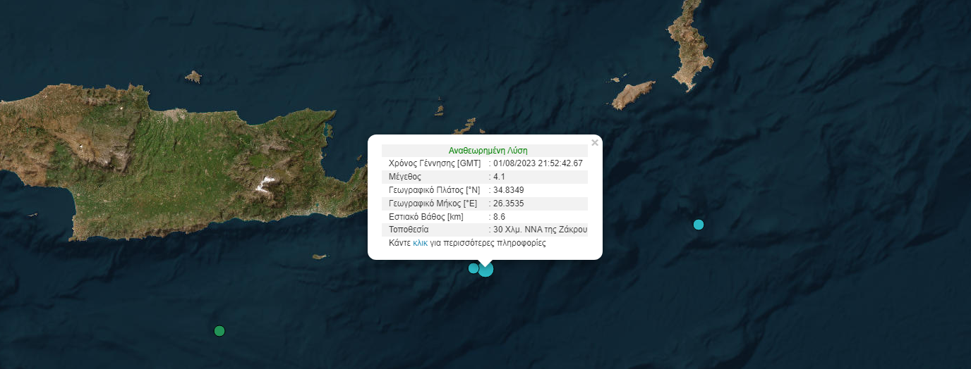 Σύμφωνα με το Γεωδυναμικό Ινστιτούτο το επίκεντρο της δόνησης εντοπίζεται 30 χλμ. Νότια, Νοτιοανατολικά της Ζάκρου, ενώ το εστιακό βάθος υπολογίζεται στα 8 χλμ.