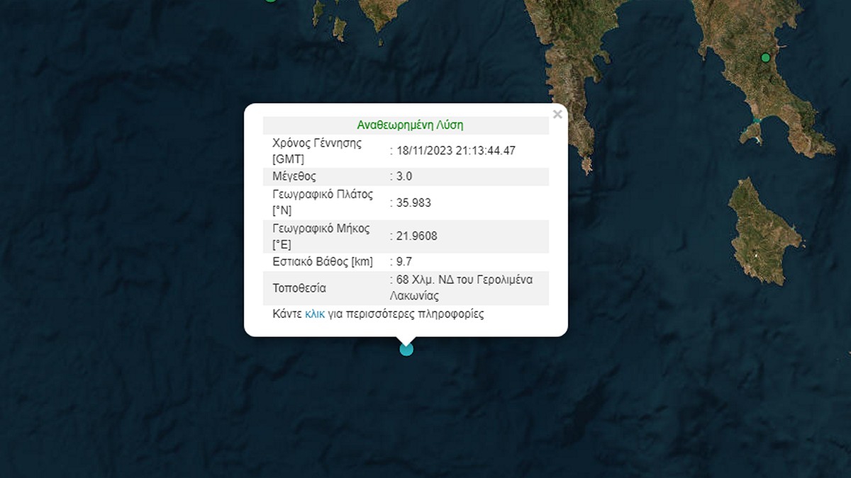Σύμφωνα με το Γεωδυναμικό Ινστιτούτο το επίκεντρο της δόνησης εντοπίζεται στα 68 χλμ. Νοτιοδυτικά του Γερολιμένα Λακωνίας, ενώ το εστιακό βάθος υπολογίζεται στα 9,7 χλμ.