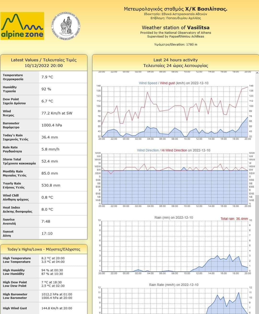 144,8 χλμ. την ώρα κατέγραψε, λίγο μετά τις 8 το βράδυ, ο μετεωρολογικός σταθμός του Εθνικού Αστεροσκοπείου Αθηνών στο Εθνικό Χιονοδρομικό Κέντρο της Bασιλίτσας.