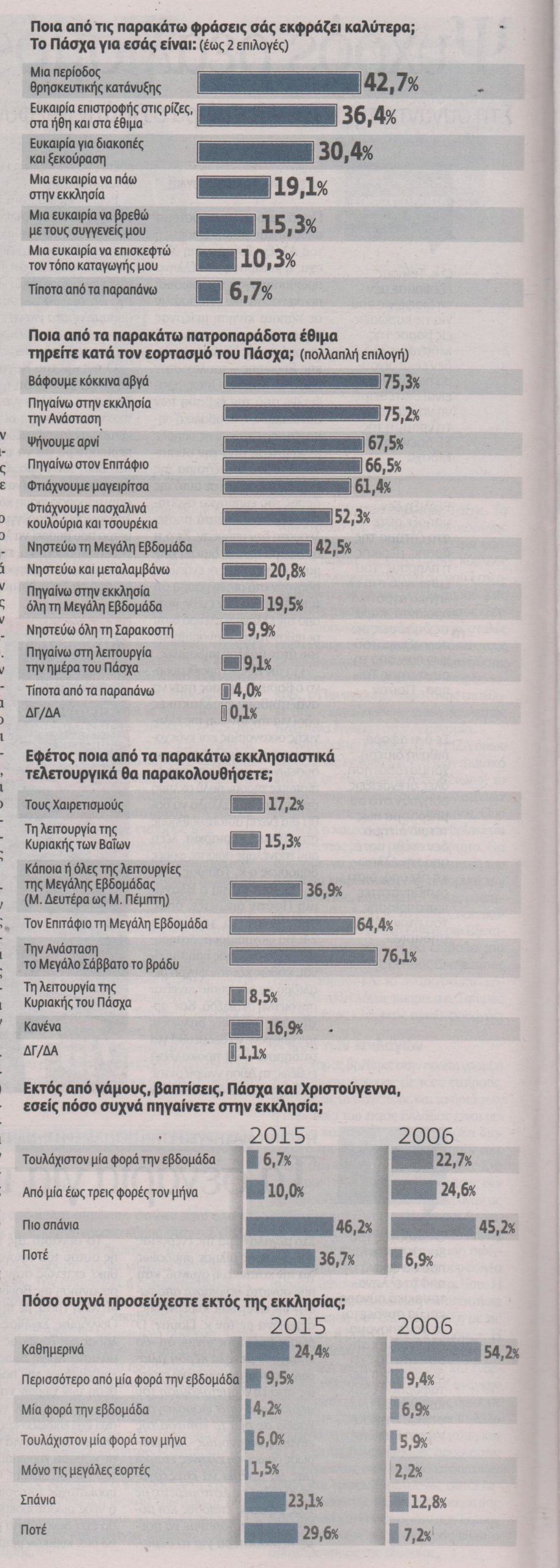 Σύμφωνα με τη δημοσκόπηση, οι Έλληνες εξακολουθούν να τηρούν τα πατροπαράδοτα έθιμα με το 75,2% να δηλώνει ότι πηγαίνει στην εκκλησία την Ανάσταση και το 45,2% να νηστεύει τη Μεγάλη Εβδομάδα. Παρ’ όλα αυτά μόνο το 9,9% των ερωτηθέντων νηστεύει τη Σαρακοστή.