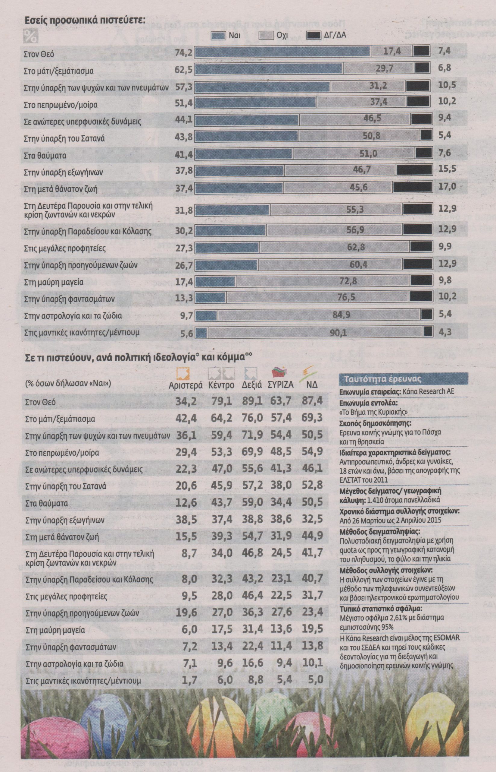 Σε υπερφυσικές δυνάμεις πιστεύει το 44,1% του συνόλου , στον Σατανά το 43,8% ενώ στους εξωγήινους 37,8%. Από τον ΣΥΡΙΖΑ στις υπερφυσικές δυνάμεις πιστεύει το 54,4%, ενω από τη ΝΔ το 50,5%. Στην ύπαρξη του Σατανά το 38,0% του ΣΥΡΙΖΑ και το 52,8% της ΝΔ. Ενώ, τέλος, στους… εξωγήινους πιστεύει το 38,6% από τον ΣΥΡΙΖΑ και το 32,5% από τη Νέα Δημοκρατία.