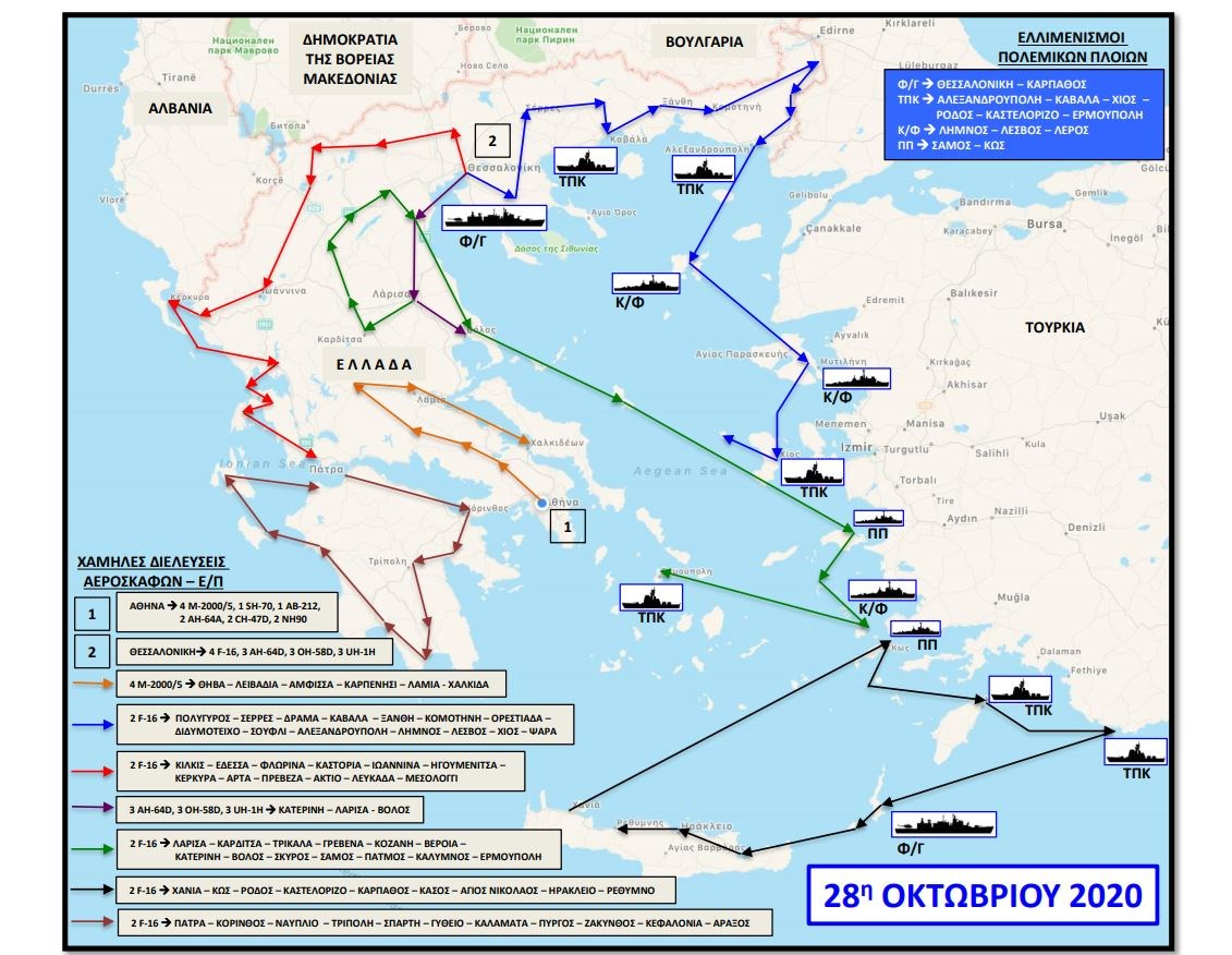 Στον χάρτη βλέπετε τις περιοχές πάνω από τις οποίες πέταξαν μαχητικά και ελικόπτερα αλλά και τα λιμάνια που έδωσαν οι μονάδες του Πολεμικού μας Ναυτικού, δίνοντας το βροντερό «παρών» απέναντι σε κάθε πρόκληση.