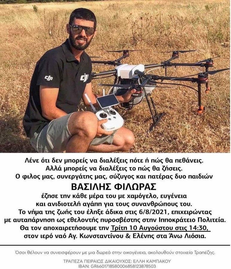 Ο πρώτος νεκρός από τις καταστροφικές φωτιές της Αττικής, ο Βασίλης Φιλώρας, πατέρας δύο παιδιών, έχασε την ζωή του άδικα, ενώ πάλευε ως εθελοντής πυροσβέστης στην Ιπποκράτειο Πολιτεία.