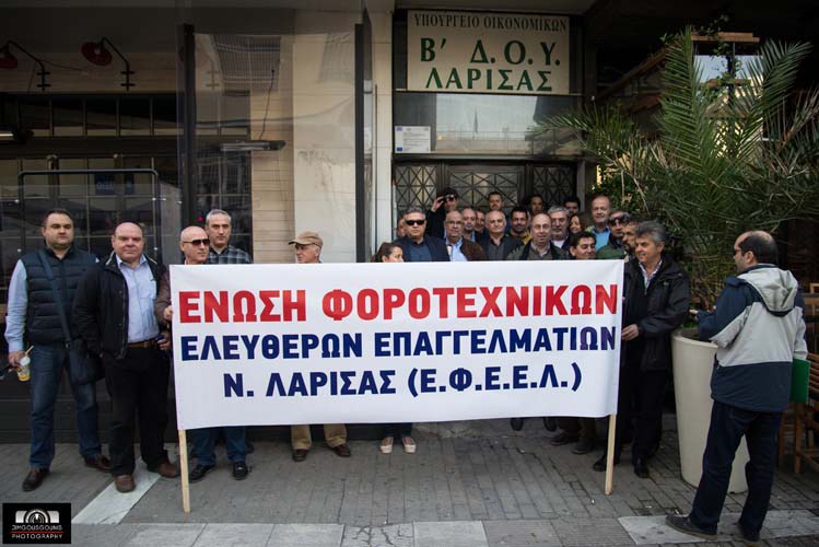 Τα μέλη της Ένωσης Φοροτεχνικών Ελεύθερων Επαγγελματιών Λάρισας ύστερα από απόφαση που έλαβε το Διοικητικό Συμβούλιο της Ένωσης, προχώρησαν σε διαμαρτυρία με συμβολική κατάληψη της Β’ Δ.Ο.Υ. Λάρισας για να δείξουν έμπρακτα την αντίθεσή τους στην ασφαλιστική και φορολογική επιδρομή της κυβέρνησης.