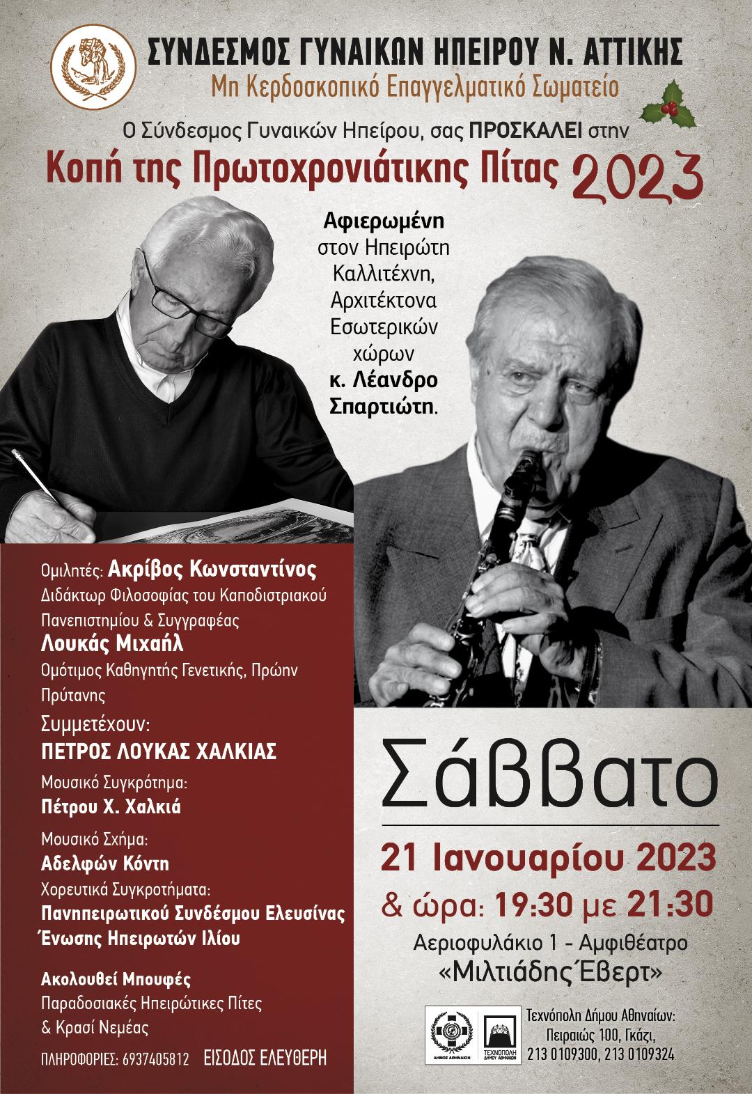 Στο πλαίσιο των δράσεων που υλοποιεί ο Σύνδεσμος Γυναικών Ηπείρου, διοργανώνεται μία σημαντική εκδήλωση, που είναι αφιερωμένη στον σπουδαίο Ηπειρώτη καλλιτέχνη, αρχιτέκτονα εσωτερικών χώρων Λέανδρο Σπαρτιώτη. Εκτός από την κοπή της πρωτοχρονιάτικης πίτας, η εκδήλωση θα περιλαμβάνει οπτικοακουστικό μορφωτικό και πολιτιστικό πρόγραμμα με θέματα από την Ήπειρο. Η εκδήλωση θα πραγματοποιηθεί το Σάββατο 21 Ιανουαρίου 2023, και ώρα 19:30, στην Τεχνόπολη του Δήμου Αθηναίων, στο Αεριοφυλάκιο 1, Αμφιθέατρο «Μιλτιάδης Έβερτ».