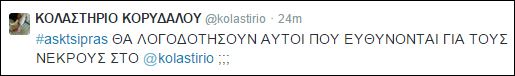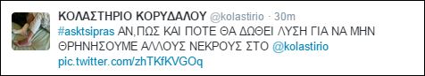 Μέσω του λογαριασμού τους «Το Κολαστήριο» οι κρατούμενοι του νοσοκομείου των φυλακών ρωτούν τον Αλέξη Τσίπρα: «Θα αντιμετωπιστούμε ως άνθρωποι; Ως ασθενείς; Θα καταφέρουμε να δούμε τις οικογένειές μας αν επιβιώσουμε;», «Θα λογοδοτήσουν αυτοί ου ευθύνονται για τους νεκρούς στο Κολαστήριο;», «Πως και πότε θα δοθεί λύση για να μη θρηνήσουμε άλλους νεκρούς στο Κολαστήριο;».