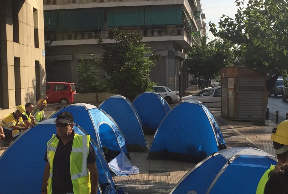 Σκηνές έξω από το Υπουργείο Παραγωγικής Ανασυγκρότησης, Περιβάλλοντος και Ενέργειας, στη Μεσογείων έστησαν από νωρίς το πρωί, οι μεταλλωρύχοι της Χαλκιδικής που δηλώνουν αποφασισμένοι να μείνουν έξω από το Υπουργείο μέχρι να δοθεί οριστική λύση στο θέμα των Μεταλλείων Κασσάνδρας.