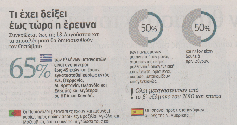 “Εκπονούμε την έρευνα”, επειδή διαπιστώσαμε μια γενικευμένη αδυναμία να προσδιοριστεί το κύμα της μαζικής μετανάστευσης” αναφέρει στην εφημερίδα “Καθημερινή” η δρ Ρουμπίνη Γρώπα, ερευνήτρια στο EUI και λέκτορας στη Νομική Θράκης. Η πρώτη εικόνα των απαντήσεων είναι ενδεικτική της κατάστασης σε κάθε χώρα. “Αντίθετα απ΄ ότι εικάζει κανείς, πάνω από το 50% των Ελλήνων εργαζόταν προτού φύγει από τη χώρα” σημειώνει η δρ Γρώπα, “πολλοί εξ αυτών, μάλιστα, είχαν παλιννοστήσει έπειτα από σπουδές στο εξωτερικο”.