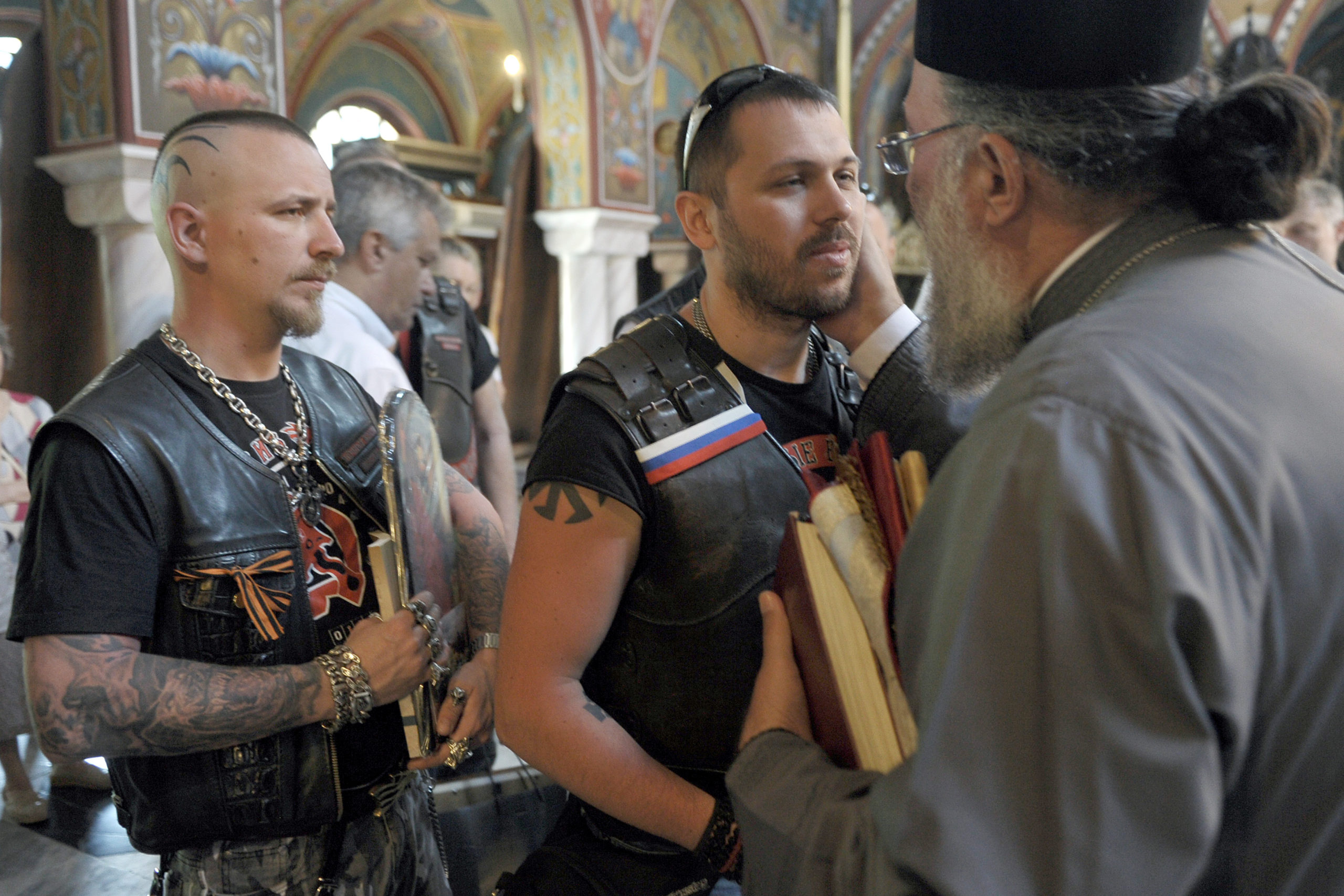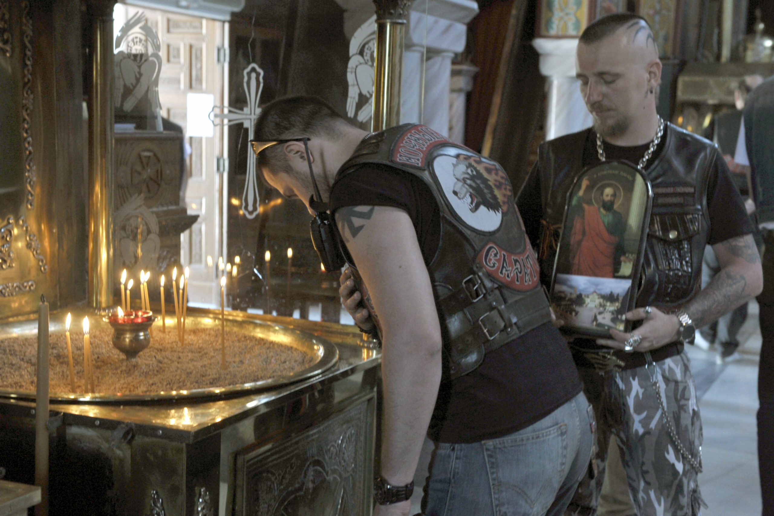 Με το χαρακτηριστικό αμάνικο δερμάτινο μπουφάν και τα μπράτσα τους, γεμάτα τατουάζ, «τρόμαξαν» τους υπόλοιπους πιστούς που βρίσκονταν εκείνη τη στιγμή στο ναό. Μιλώντας ρωσικά έκαναν τους πάντες να αναρωτηθούν, για ποιο λόγο βρίσκονται εκεί. Στην πραγματικότητα, τα μέλη των «λύκων της νύχτας», ήθελαν να κάνουν ότι και οι υπόλοιποι πιστοί. Να προσκυνήσουν εικόνες και να λάβουν την ευλογία του παπά, όπως κι έγινε.