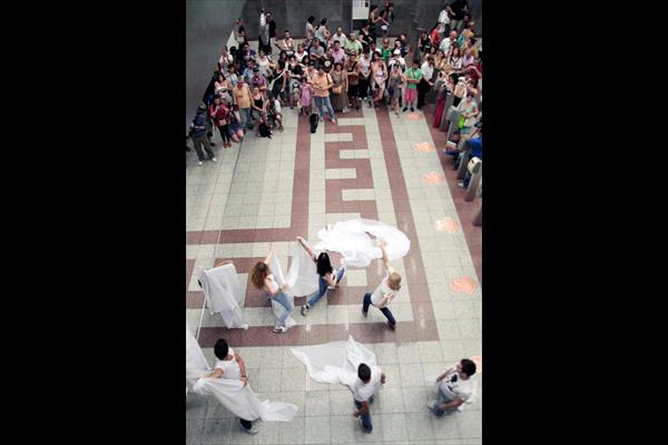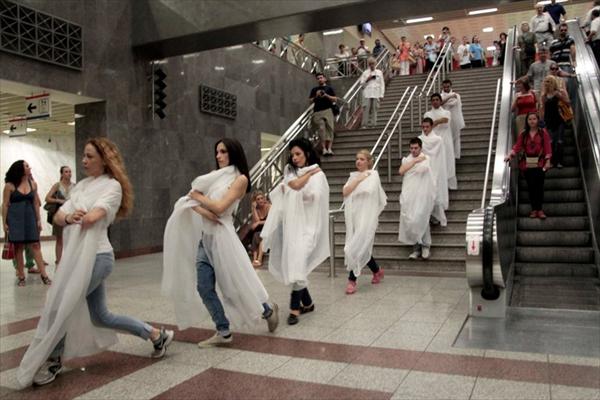 Οι επιβάτες που βρέθηκαν την ώρα εκείνη στο επίπεδο του σταθμαρχείου, είχαν την ευκαιρία να απολαύσουν ένα απόσπασμα της γνωστής κωμωδίας του Αριστοφάνη, που ανεβάζει το Εθνικό Θέατρο.