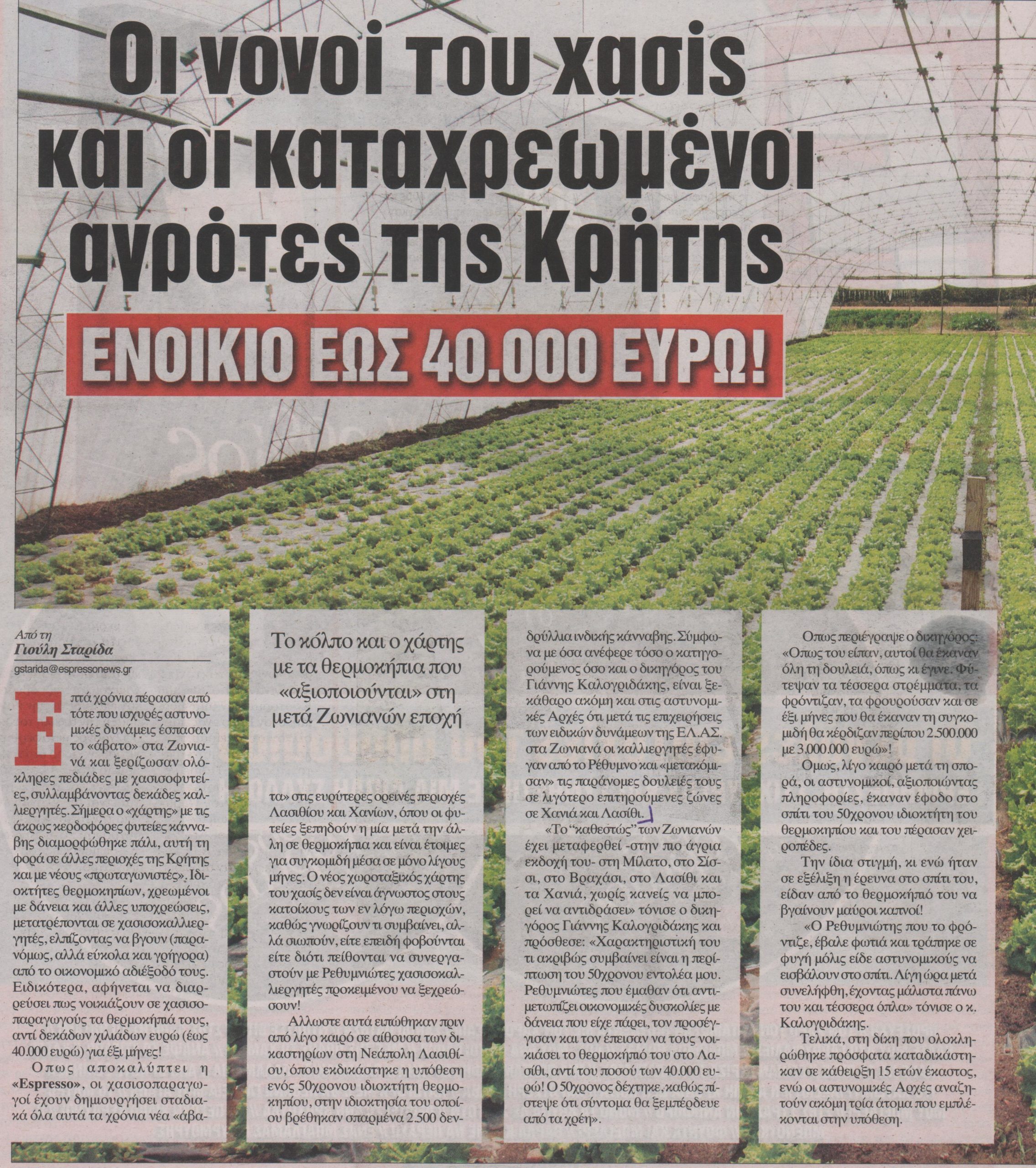 Σήμερα ο «χάρτης» με τις άκρως κερδοφόρες φυτείες κάνναβης διαμορφώθηκε πάλι, αυτή τη φορά σε άλλες περιοχές της Κρήτης και με νέους «πρωταγωνιστές». Ιδιοκτήτες θερμοκηπίων, χρεωμένοι με δάνεια και άλλες υποχρεώσεις, σύμφωνα με την Espresso, μετατρέπονται σε χασισοκαλλιεργητές, ελπίζοντας να βγουν (παρανόμως, αλλά εύκολα και γρήγορα) από το οικονομικό αδιέξοδό τους. Ειδικότερα, αφήνεται να διαρρεύσει πως νοικιάζουν σε χασισοπαραγωγούς τα θερμοκήπιά τους, αντί δεκάδων χιλιάδων ευρώ (έως 40.000 ευρώ) για έξι μήνες!