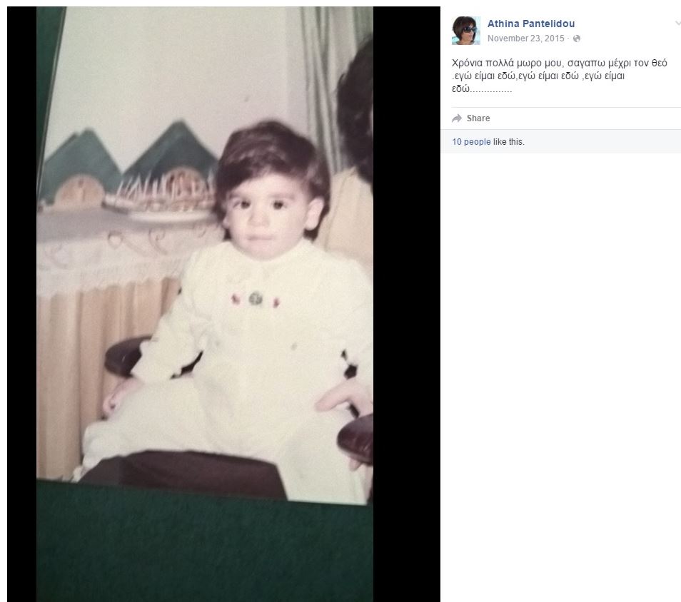 «Χρόνια πολλά μωρό μου. Σ’ αγαπώ μέχρι το Θεό, εγώ είμαι εδώ, εγώ είμαι εδώ, εγώ είμαι εδώ».