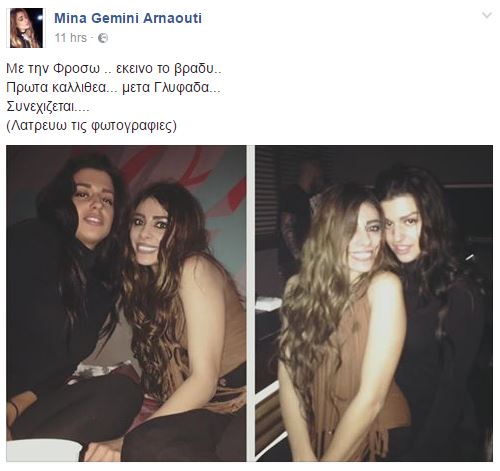 Στον προσωπικό της λογαριασμό στο facebook, η Μίνα Αρναούτη ανέβασε δύο φωτογραφίες μαζί με την Φρόσω Κυριακού, από το μοιραίο βράδυ που κόπηκε το νήμα της ζωής του τραγουδιστή, Παντελή Παντελίδη.