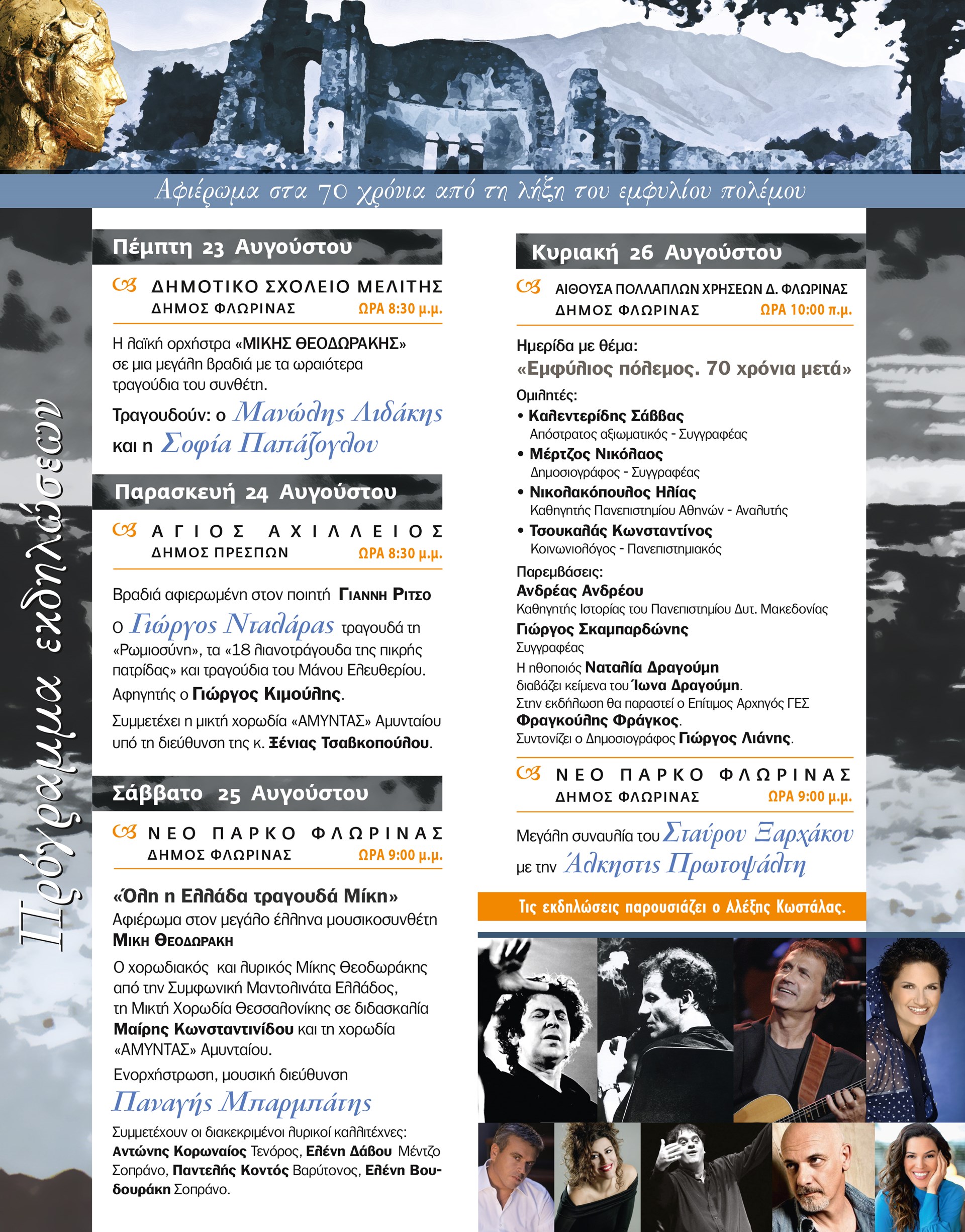 • Θα έχει προηγηθεί στις 23 Αυγούστου στο υπέροχο κεφαλοχώρι της Φλώρινας , Μελίτη ο λαϊκός Μίκης Θεοδωράκης , ο απέραντος και τρυφερός . Με τραγούδια που είναι τα άγια των αγίων στο λαϊκό μας τραγούδι. Θα τραγουδήσουν ο Μανώλης Λιδάκης και η Σοφία Παπάζογλου.