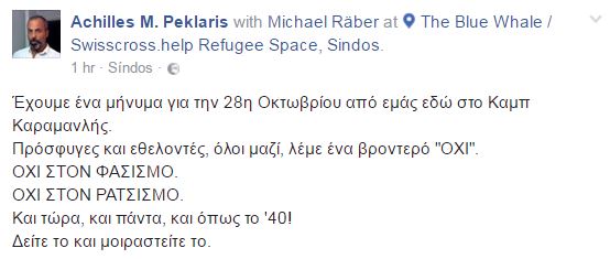 «Έχουμε ένα μήνυμα για την 28η Οκτωβρίου από εμάς εδώ στο Καμπ Καραμανλής. Πρόσφυγες και εθελοντές, όλοι μαζί, λέμε ένα βροντερό «ΟΧΙ». ΟΧΙ ΣΤΟΝ ΦΑΣΙΣΜΟ. ΟΧΙ ΣΤΟΝ ΡΑΤΣΙΣΜΟ. Και τώρα, και πάντα, και όπως το ’40!», αναφέρει ο Αχιλλέας Πεκλάρης από το κέντρο φιλοξενίας «Καραμανλής», ο οποίος ανέβασε και το βίντεο με το μήνυμα προσφύγων και εθελοντών στο προσωπικό του λογαριασμό στο facebook.