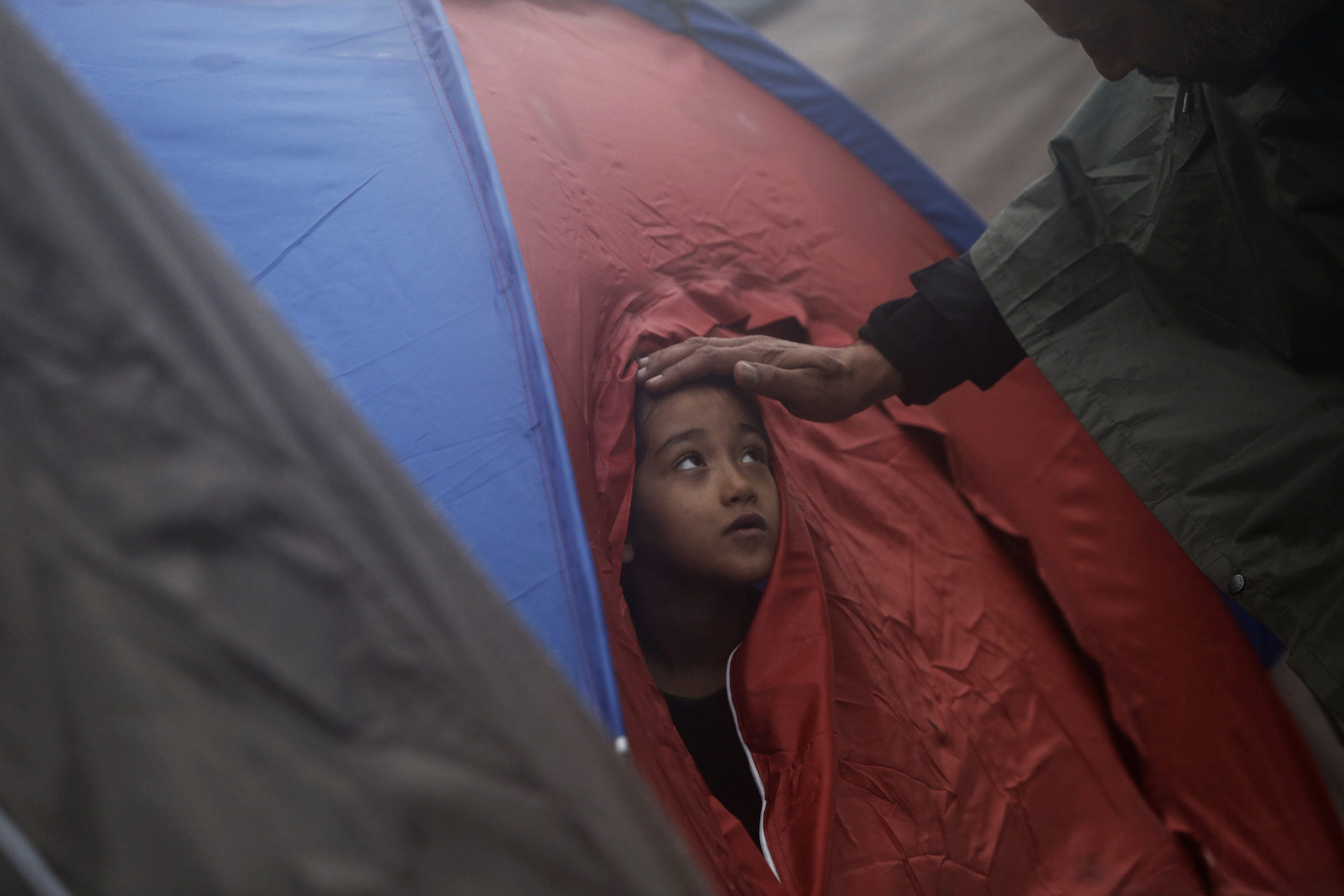 Την ίδια στιγμή, ιδιαίτερα συγκινητική είναι η φωτογραφία στην οποία απεικονίζεται το στοργικό χάδι ενός πατέρα στο παιδί του, την ώρα που αυτό κάθεται στην βρεγμένη από την βροχή, σκηνή.