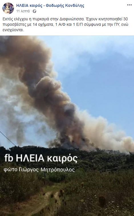Δείτε τις πρώτες εικόνες από τη φωτιά που ξέσπασε σε δασική έκταση στη Δαφνιώτισσα στην Αμαλιάδα του νομού Ηλείας.Στο σημείο για την κατάσβεση της φωτιάς επιχειρούν 30 πυροσβέστες με 14 οχήματα και 11 άτομα πεζοπόρο τμήμα, ενώ από αέρος συνδράμουν ένα αεροσκάφος και ένα ελικόπτερο.Τις φωτογραφίες δημοσίευσε στο προφίλ του στο Facebook ο Θοδωρής Κονδύλης.