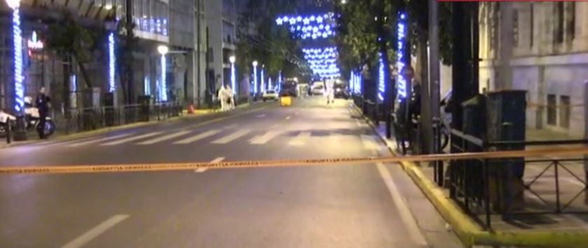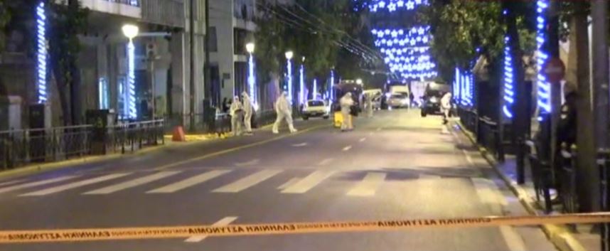 Άνδρες της Αστυνομίας ελέγχουν ύποπτο αντικείμενο που βρέθηκε έξω από το Υπουργείο Εργασίας, μετά από απειλητικό τηλεφώνημα για βόμβα.