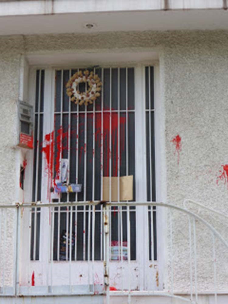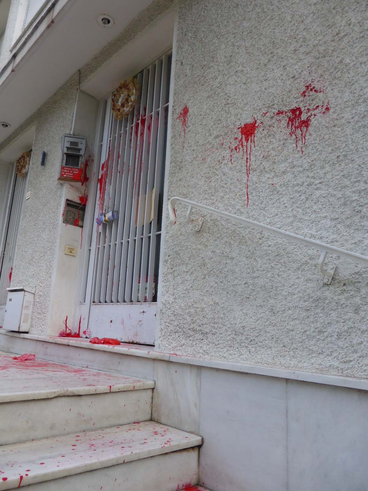 Οι πρώτες εικόνες από το σπίτι του Μίκη Θεοδωράκη στην περιοχή της Ακρόπολης, όπου το μεσημέρι του Σαββάτου άγνωστοι δράστες πέταξαν κόκκινες μπογιές στην είσοδο της οικίας του μουσικοσυνθέτη.