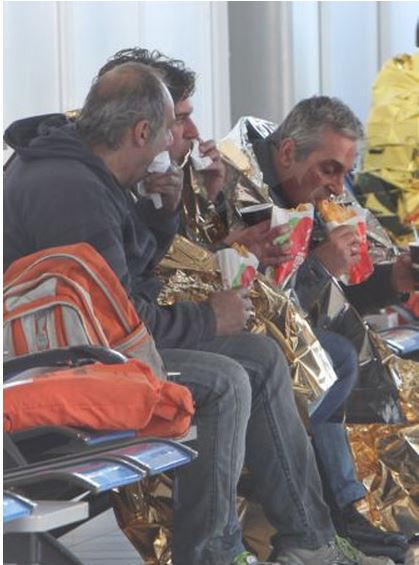 Οι πρώτοι επιβάτες που διασώθηκαν από το φλεγόμενο πλοίο «Norman Atlantic» λαμβάνουν τις πρώτες βοήθειες και ένα πρόχειρο γεύμα για να δυναμώσουν στο αεροδρόμιο της Κέρκυρας.