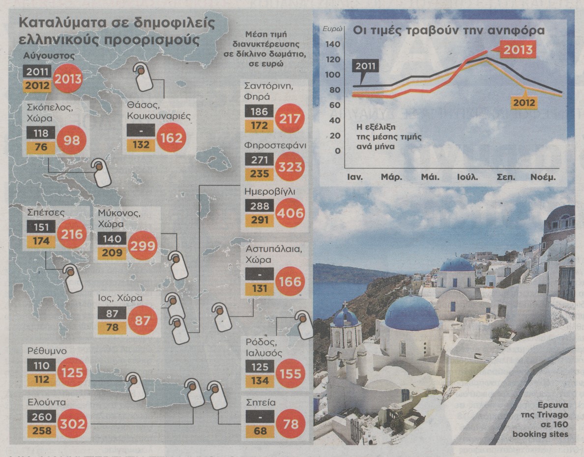 Οι ταξιδιώτες κλήθηκαν κατά μέσο όρο να πληρώσουν 119 ευρώ ανά διανυκτέρευση τον Αύγουστο του 2012 και 121 ευρώ  τον Αύγουστο του 20122. Φέτος, τους ζητήθηκαν 131 ευρώ.