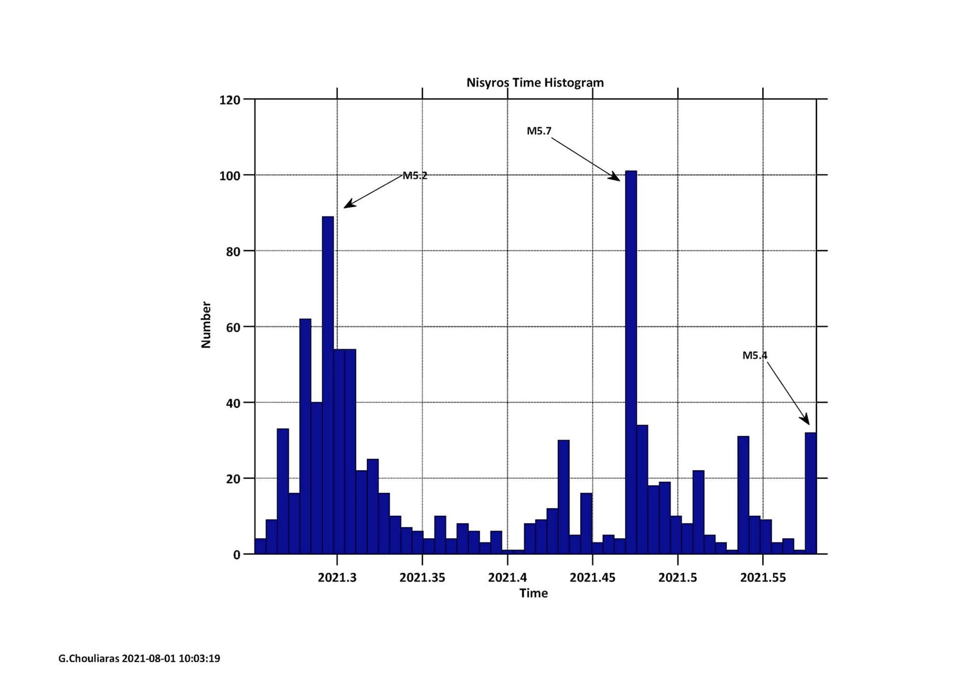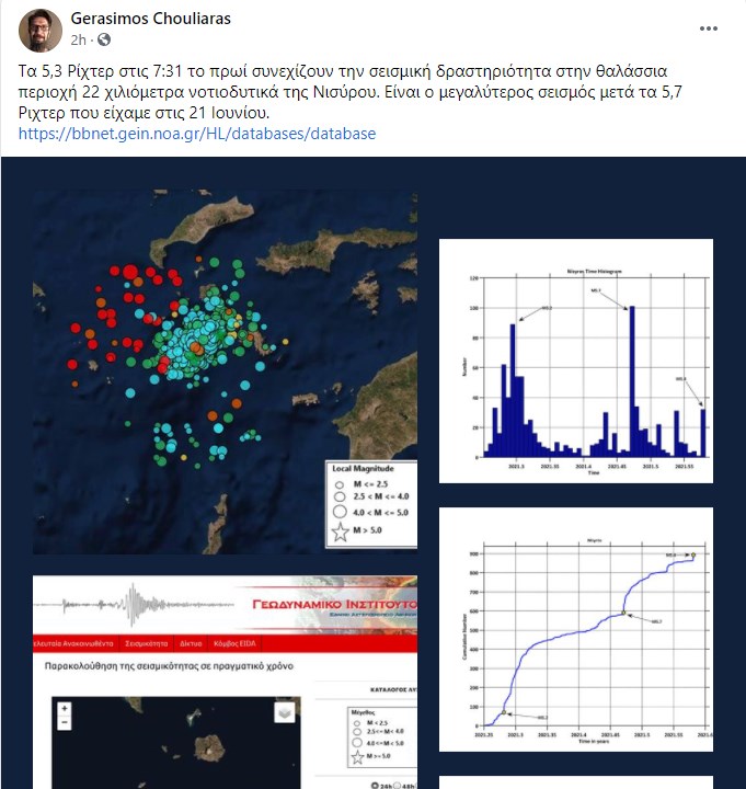 Έντονη είναι η σεισμική δραστηριότητα στη Νίσυρο από χθες το βράδυ. “Τα 5,3 Ρίχτερ στις 7:31 το πρωί συνεχίζουν την σεισμική δραστηριότητα στην θαλάσσια περιοχή 22 χιλιόμετρα νοτιοδυτικά της Νισύρου. Είναι ο μεγαλύτερος σεισμός μετά τα 5,7 Ριχτερ που είχαμε στις 21 Ιουνίου” αναφέρει ο σεισμολόγος και διευθυντής Ερευνών του Γεωδυναμικού Ινστιτούτου Αθηνών Γεράσιμος Χουλιάρας σε ανάρτησή του στο facebook.