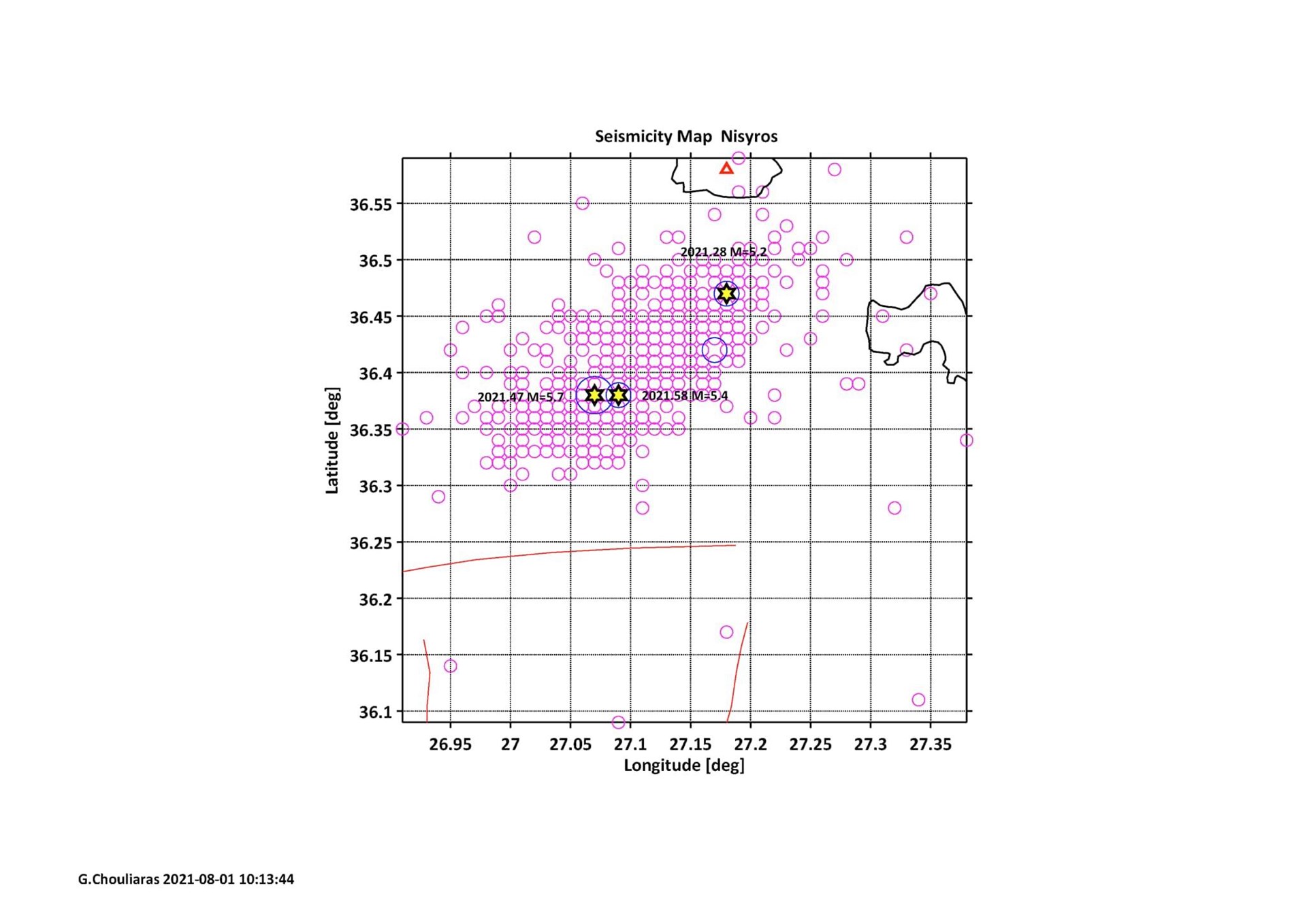 Υπενθυμίζουμε ότι το επίκεντρο της νέας δόνησης εντοπίστηκε στον θαλάσσιο χώρο 23 χιλιόμετρα νότια-νοτιοδυτικά της πόλης της Νισύρου, και το εστιακό του βάθος ήταν 15,6 χιλιόμετρα. Είχαν προηγηθεί άλλες δύο σεισμικές δονήσεις, 4,7 και 4,1 βαθμών της κλίμακας Ρίχτερ, στις 22:57 του Σαββάτου και στις 02:25 τα ξημερώματα της Κυριακής, αντίστοιχα 26 και 27 χιλιόμετρα νότια-νοτιοδυτικά του νησιού.