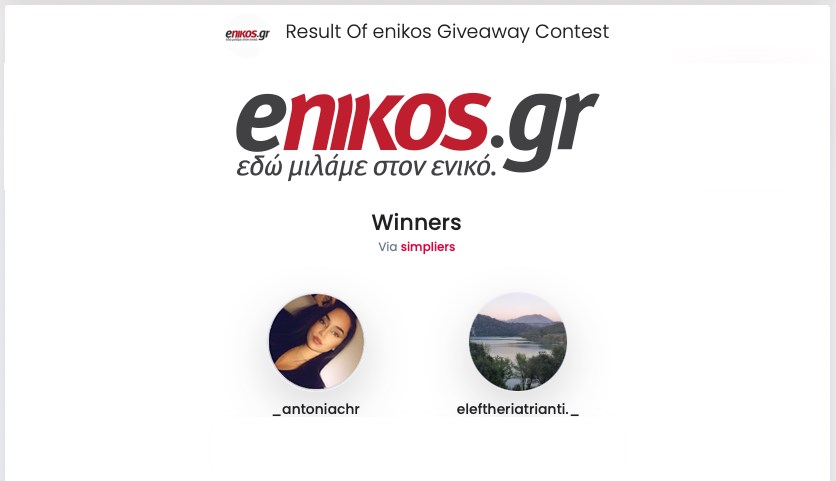 Η κλήρωση πραγματοποιήθηκε μεταξύ όλων των αναγνωστών που είχαν κάνει Follow στη σελίδα τουenikos.gr στο Instagram και Like στην ανάρτηση για την κλήρωση. Η κλήρωση έγινε μέσω της πλατφόρμας Simpliers.
