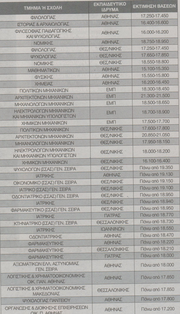 Οι διαφορετικές επιδόσεις των υποψηφίων σε Θεωρητική, Θετική και Τεχνολογική Κατεύθυνση και η ζήτηση σχολών που χρωματίστηκε από τις συνέπειες της οικονομικής κρίσης “κατασκεύασαν” φέτος βάσεις πολλών ταχυτήτων.Με μια πρώτη ανάγνωση, ανεβαίνουν οι νομικές σχολές, ακλόνητες παραμένουν οι ιατρικές, πέφτουν οι πολυτεχνικές. Ανοδος καταγράφεται σε αστυνομικά και στρατιωτικά τμήματα.