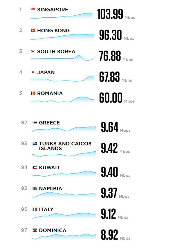 Η έρευνα δείχνει ότι οι περιοχές με το πιο γρήγορο Internet είναι η Σιγκαπούρη (104.25 Mbps download speeds) και το Hong Kong (96.38Mbs), ενώ στην παγκόσμια κατάταξη η Ελλάδα βρίσκεται στην 92η θέση με 9,64 Mbps.