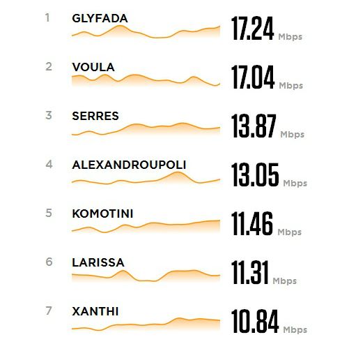 Την ίδια στιγμή, οι περιοχές με τις μεγαλύτερες ταχύτητες στην Ελλάδα είναι η Γλυφάδα και η Βούλα, την τριάδα συμπληρώνουν οι Σέρρες και στις θέσεις 4 και 5 βρίσκονται Αλεξανδρούπολη και Κομοτηνή αντίστοιχα. Σημειώνεται ότι η Αθήνα βρίσκεται στη θέση 16 και η Θεσσαλονίκη στην 17η θέση.