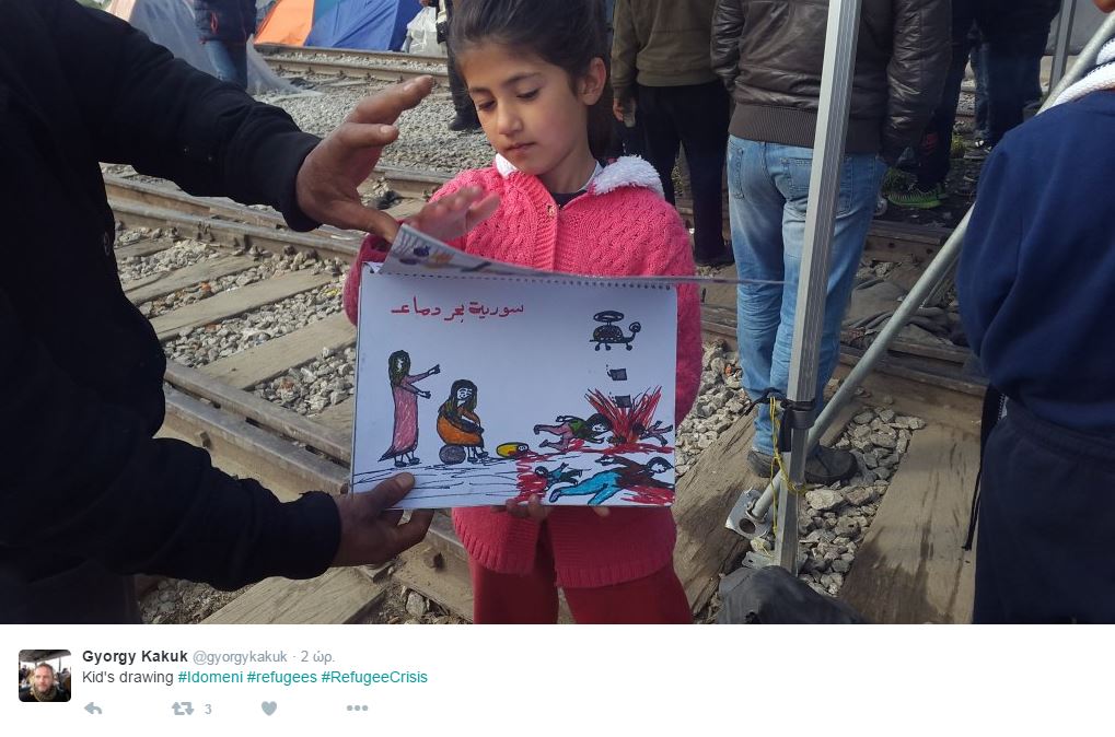 Χαρακτηριστικό παράδειγμα είναι ένα χαριτωμένο κοριτσάκι που τις τελευταίες ημέρες ζει στην Ειδομένη και με τις ζωγραφιές της αποτυπώνει τις βόμβες στη χώρα της και την “οδύσσεια” της μέχρι να φτάσει στην Ελλάδα.
